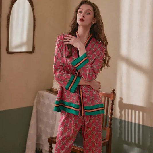 Spring Women's Long Sleeve Ice Silk Printed Pajamas Set